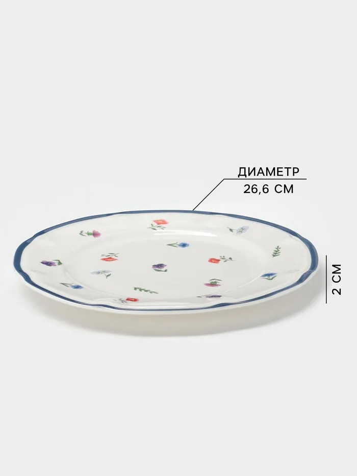 Изготовленная из нового костяного фарфора, эта тарелка диаметром 26.6 см идеально подходит для сервировки основных блюд и десертов. Её цветочный рисунок придает неповторимый шарм любому столу. Она станет украшением вашей кухни и особенным акцентом при создании атмосферы романтики.