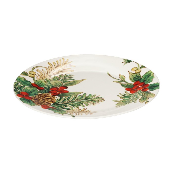 Тарелка изготовлена из прочного костяного фарфора и украшена красивым новогодним рисунком. Изделие универсально и подходит как для вторых блюд, так и для подачи салатов, закусок и пр.
