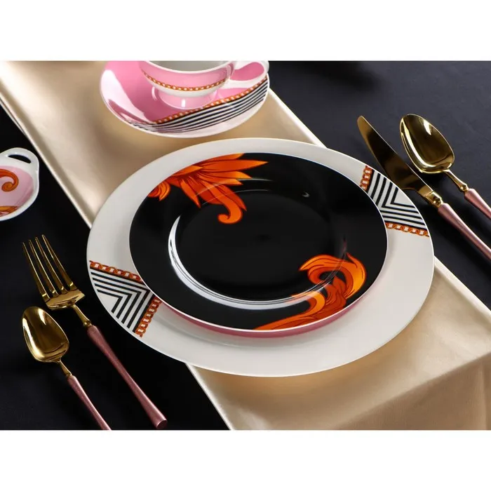 Сервировка стола с оригинальной посудой из фарфора Magistro «Миледи» теперь станет настоящим удовольствием! Необычный орнамент в виде золотых узоров и насыщенные цвета изделий добавят изюминку и станут ярким акцентом на вашей кухне.