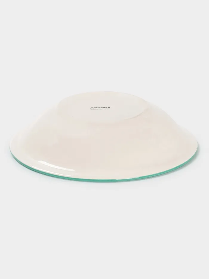 Глубокая тарелка Доляна объёмом 600 мл прекрасно подходит для сервировки супов и других горячих блюд. Её бирюзовый цвет и рисунок в полоску подчеркнут стиль вашего стола. Изготовленная из прочной керамики, она устойчива к высоким температурам и безопасна для использования в микроволновой печи. Круглая форма и гладкая текстура делают тарелку не только функциональной, но и эстетически привлекательной. Деколь добавляет изысканности, не оставляя равнодушными ваших гостей.