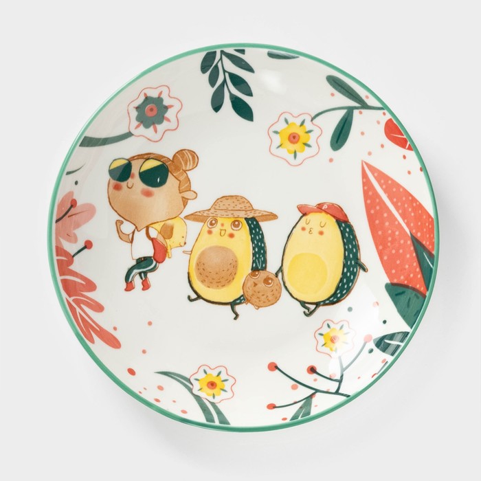 Тарелка «Прогулка авокадо» изготовлена из качественной керамики. Такая посуда отличается высокой прочностью, устойчива к появлению царапин и резким перепадам температур. Изделие в ярких цветах с весёлым принтом украсит интерьер кухни, а также прекрасно подойдёт в качестве подарка.