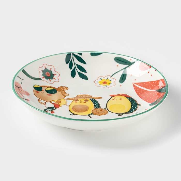 Тарелка «Прогулка авокадо» изготовлена из качественной керамики. Такая посуда отличается высокой прочностью, устойчива к появлению царапин и резким перепадам температур. Изделие в ярких цветах с весёлым принтом украсит интерьер кухни, а также прекрасно подойдёт в качестве подарка.