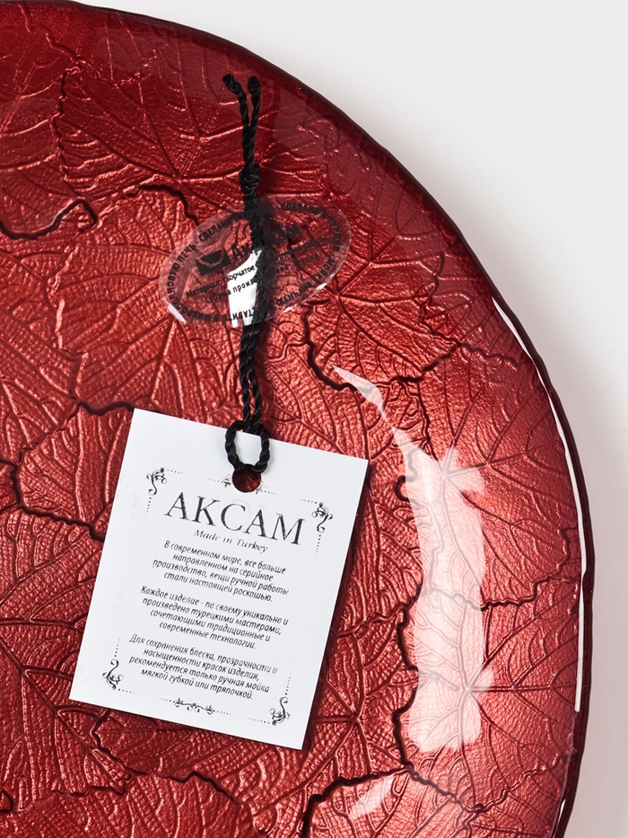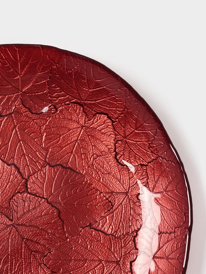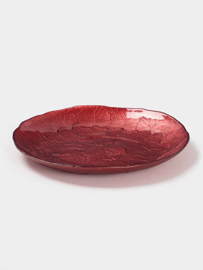 Красная стеклянная тарелка с растительным узором — это смелая подача, где цвет и тема работают вместе. Глубокий красный оттенок напоминает спелые ягоды, листья в увядании, тёплый свет заката — ассоциации с поздней осенью возникают сами.