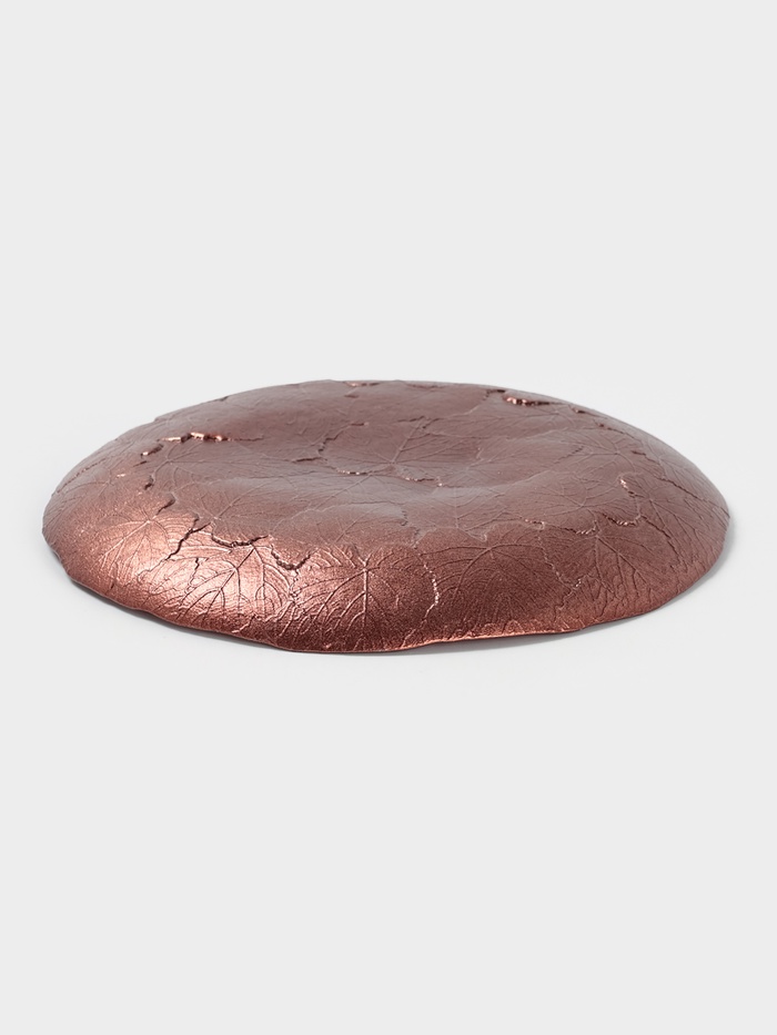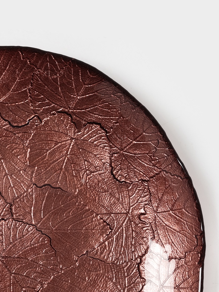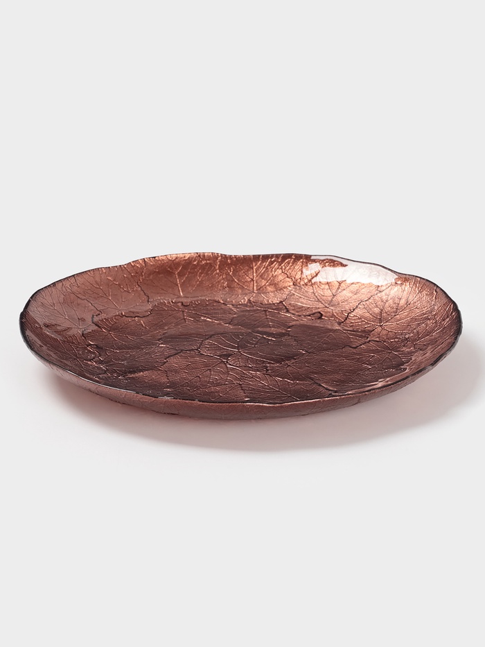 Большая стеклянная тарелка с растительным узором — центральный элемент стола, где важна не только еда, но и атмосфера. Цвет напоминает отблески на старом металле, а рисунок — сухие ветви, застывшие в симметрии.