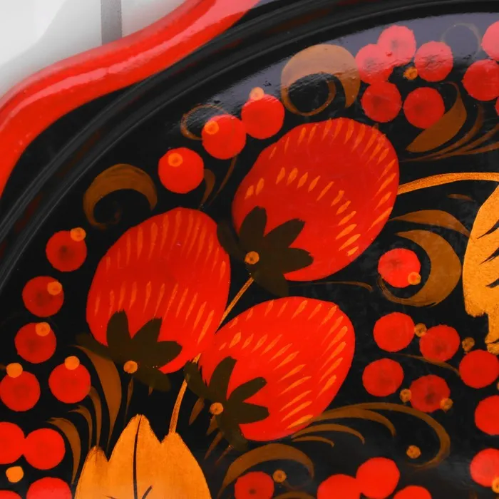Традиционные элементы Хохломы — ягоды рябины и земляники, цветы и листья, птицы, рыбы и звери.