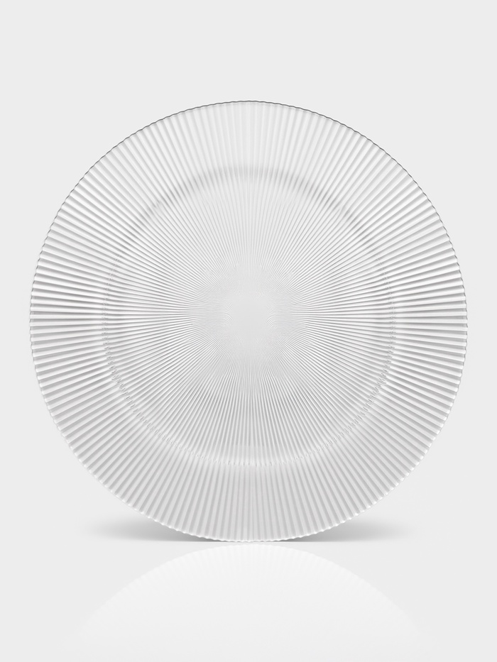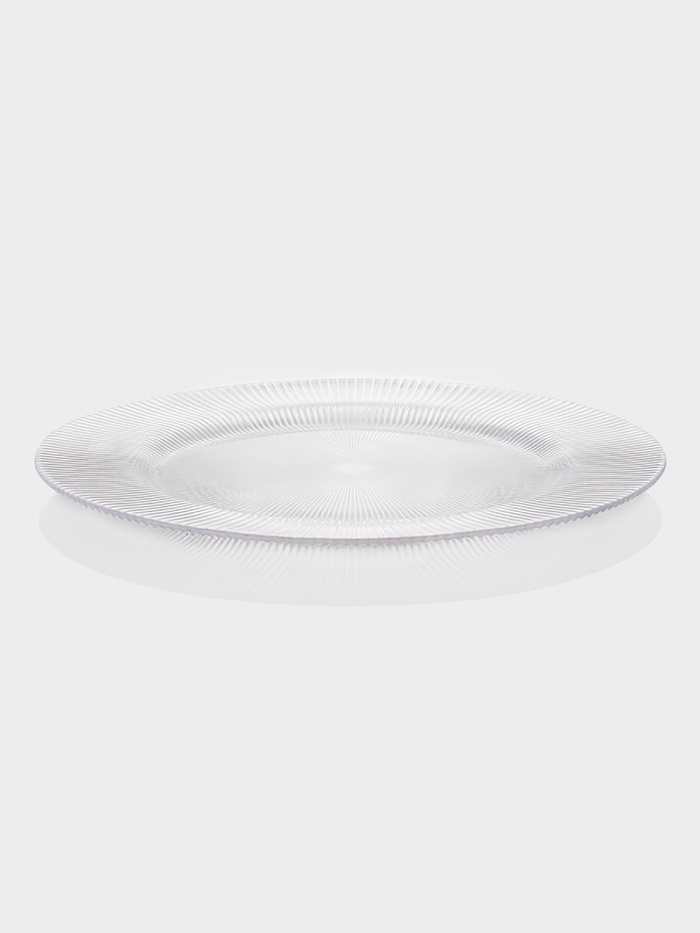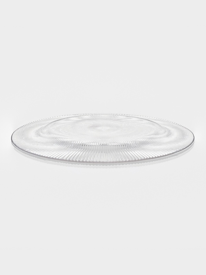 Прозрачная стеклянная плоская тарелка диаметром 32,5 см с выразительным рельефом, напоминающим тонкие грани огранённого кристалла. Её задача — не просто держать блюдо, а добавлять свет, глубину и структуру сервировке без единого рисунка.