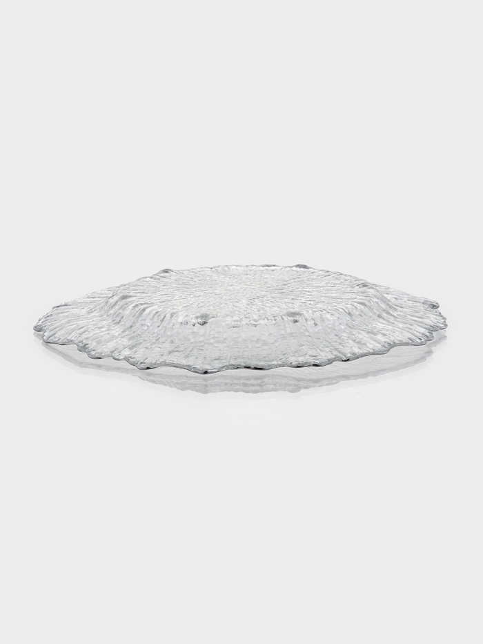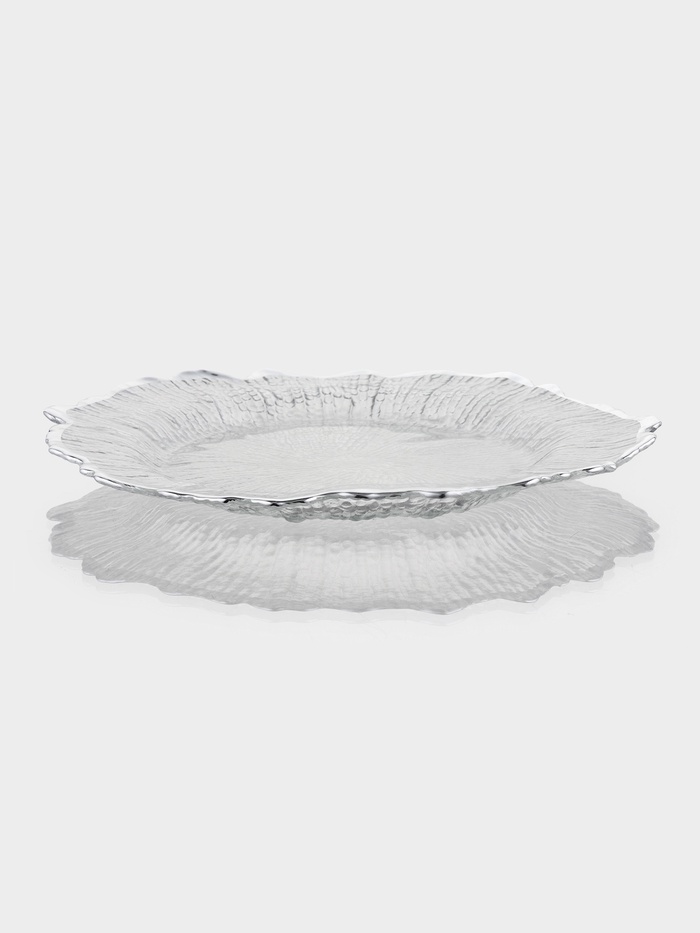 Элегантность, подчёркнутая сиянием серебра. Плоская тарелка с серебряной отводкой – это сочетание прозрачного стекла и тонкой декоративной окантовки, которая придаёт изделию благородный вид.
