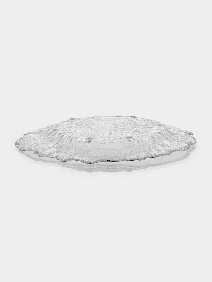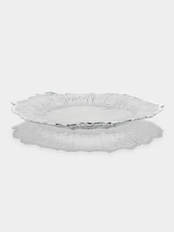 Элегантность, подчёркнутая сиянием серебра. Плоская тарелка с серебряной отводкой – это сочетание прозрачного стекла и тонкой декоративной окантовки, которая придаёт изделию благородный вид.