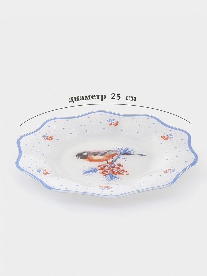 Тарелка новогодняя Доляна «Снегири на ветке», d=25 см, h=2 см, стекло, белая, голубая — Характеристики