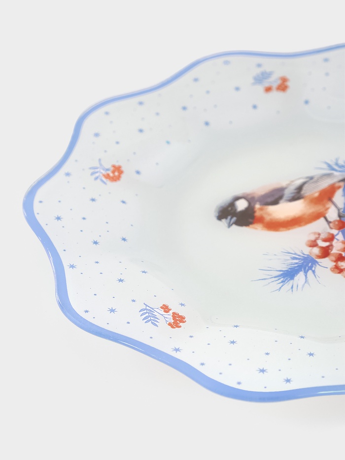 Зима на вашем столе — в каждом элементе! Тарелка — элегантная основа для сервировки новогоднего и рождественского застолья. Белое стекло с голубым рисунком снегирей создаёт атмосферу уюта и лёгкой праздничной ностальгии.