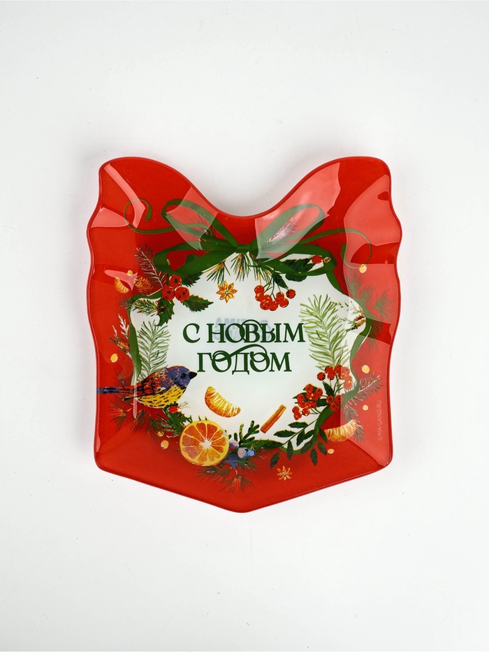 Новогодняя стеклянная тарелка в форме подарка — идеальный выбор для сервировки стола.