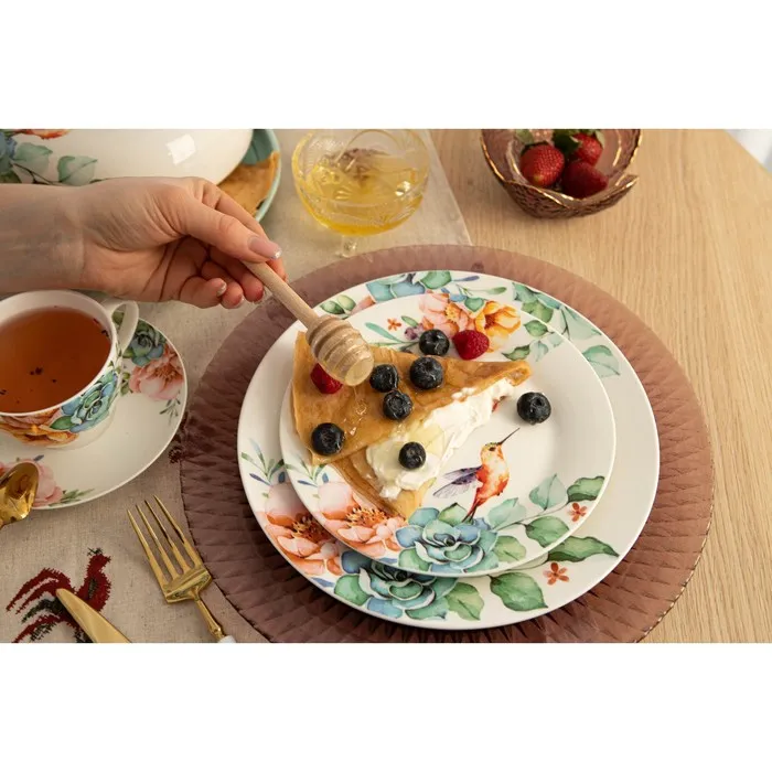 Тарелка Доляна «Пташка» изготовлена из качественного костяного фарфора. Такая посуда не только тоньше, но и заметно легче, чем аналогичные изделия из обычного фарфора. Благодаря оригинальному дизайну изделие легко украсит вашу кухню, а также прекрасно подойдёт в качестве подарка. Тарелка выполнена в приятных тонах, что позволит вписать её практически в любой интерьер.