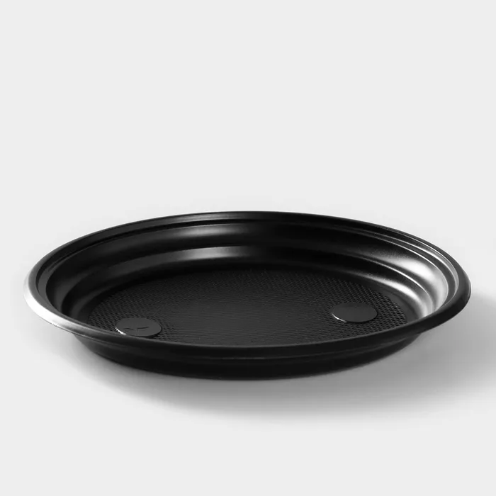 Черные пластиковые тарелки диаметром 20,5 см — практичное решение для сервировки. Изготовлены из пищевого полистирена, подходят для холодных блюд и закусок.
