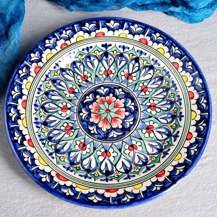 Керамическая плоская тарелка диаметром 22 см — это посуда, в которой сочетаются практичность и художественная выразительность. Синее основание с разноцветным узором придаёт изделию насыщенность и индивидуальность. Каждая линия орнамента выполнена вручную, подчёркивая связь с ремёслом и культурной традицией.