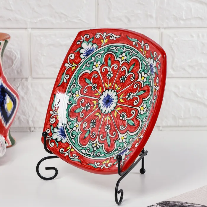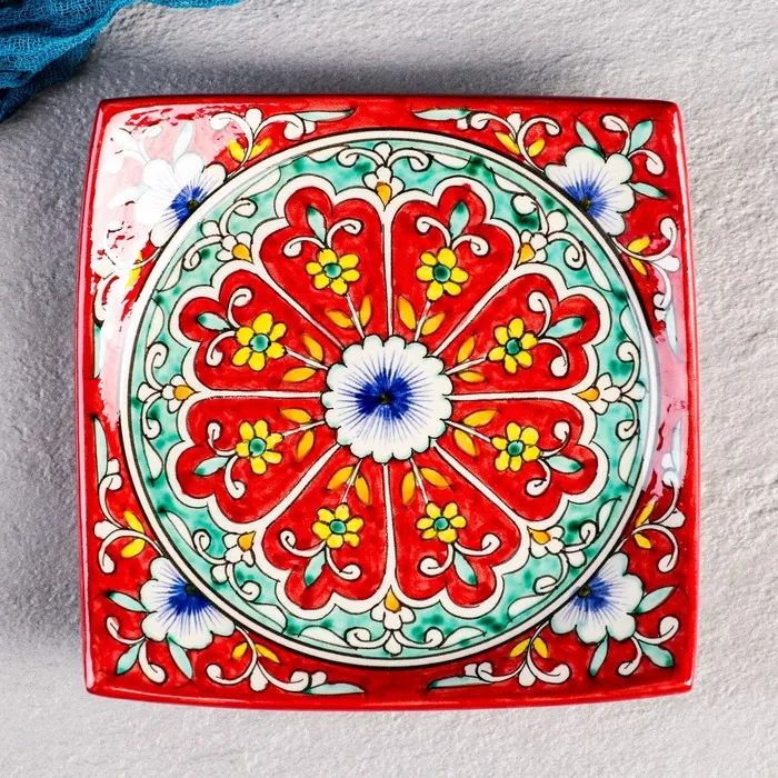 Тарелка Риштанская Керамика «Узоры», d=20 см, квадратная, керамика, красная — Характеристики