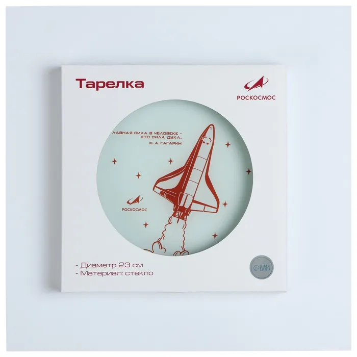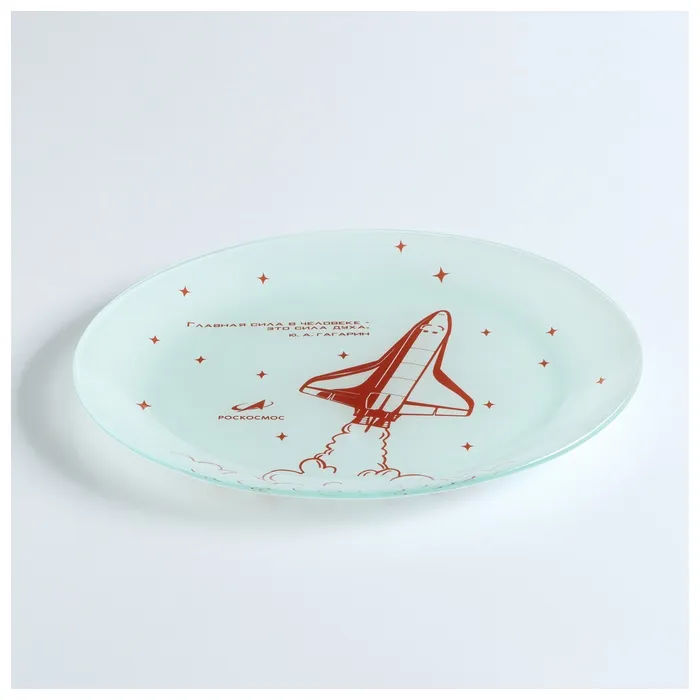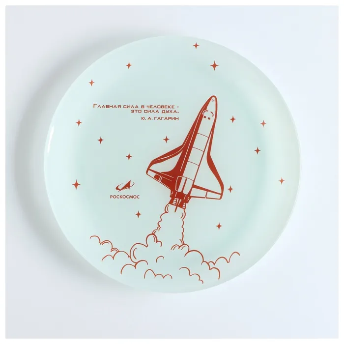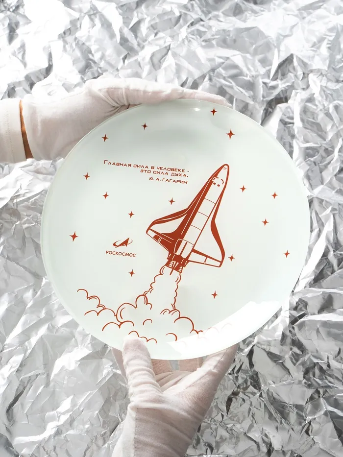 На тарелке изображён орбитальный космический корабль «Буран». Уникальный дизайн лицензирован государственной корпорацией «Роскосмос».