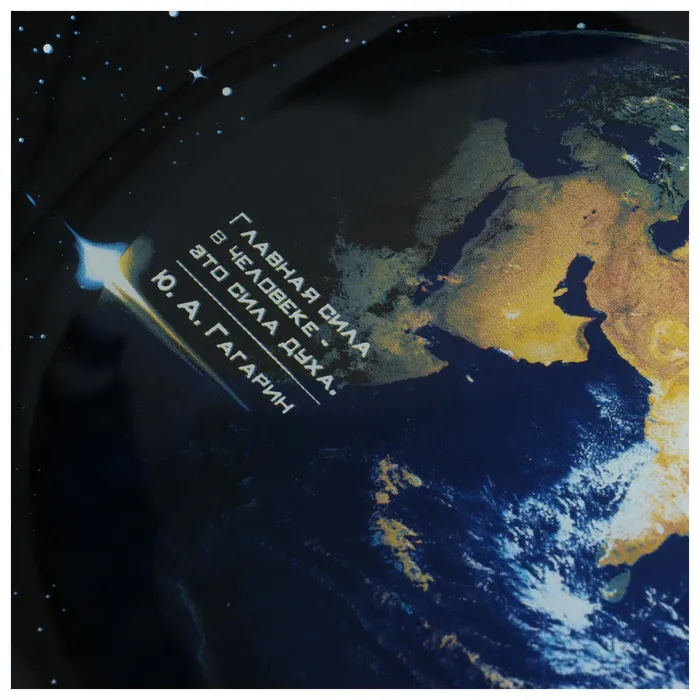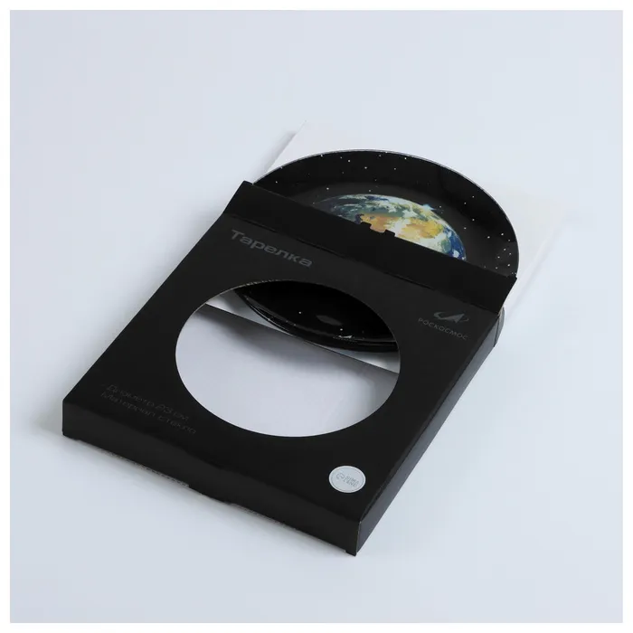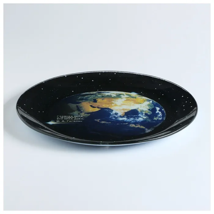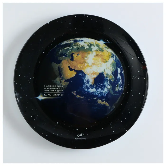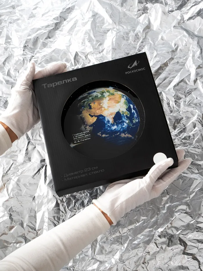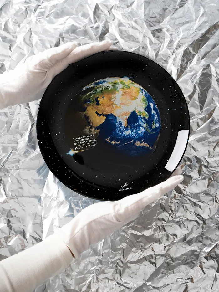 На тарелке изображена планета Земля. Уникальный дизайн лицензирован государственной корпорацией «Роскосмос».