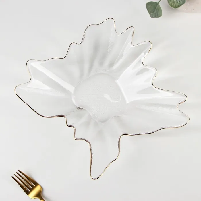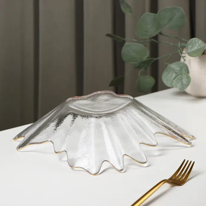Тарелка сервировочная «Рени» изготовлена из качественного и прочного стекла. Посуда имеет необычную форму, красивый рельеф и отводку золотом по краю. Такая тарелка станет изюминкой сервировки и украсит праздник.