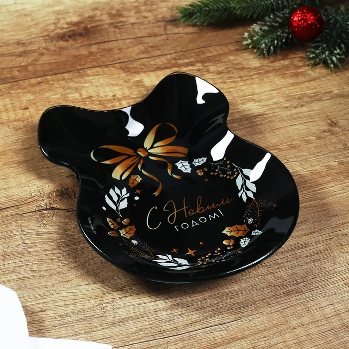 Тарелка в форме банта новогодняя «С Новым годом», 13.5×18 см, стекло — Характеристики
