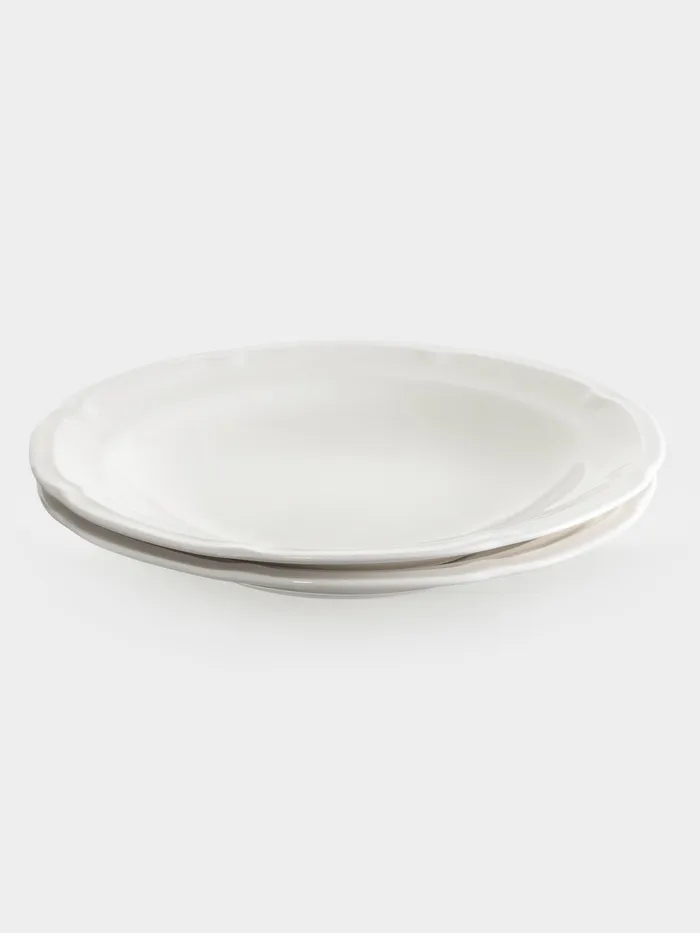 Набор из двух белых фарфоровых тарелок объемом 220 мл и диаметром 22 см. Отличительной особенностью является рельефная текстура и барельефный декор, придающий им особый шарм. Идеальны для подачи супов-пюре, соусов, десертов или небольших порций салатов. Можно использовать в микроволновой печи и мыть в посудомоечной машине.