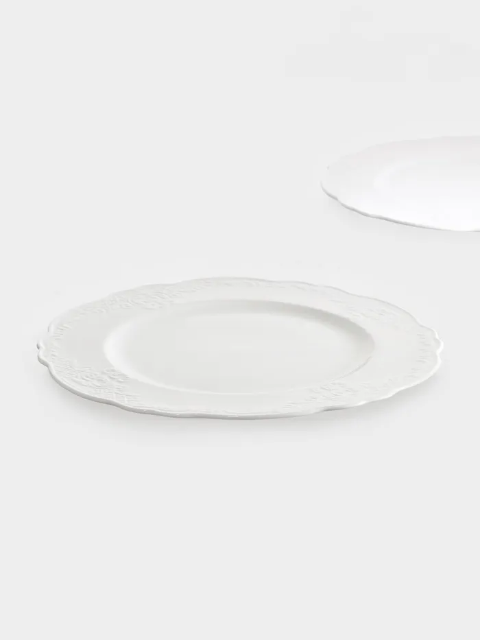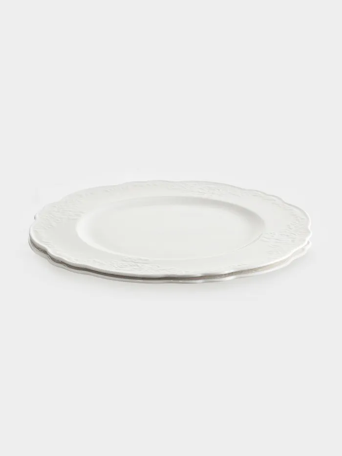 Представляем вам набор из двух белых фарфоровых тарелок диаметром 27 см, выполненных из нового костяного фарфора с рельефным узором и барельефом. Идеальны для подачи основных блюд. Можно использовать в микроволновой печи и мыть в посудомоечной машине.