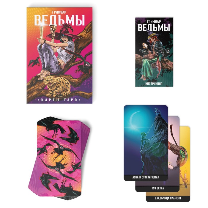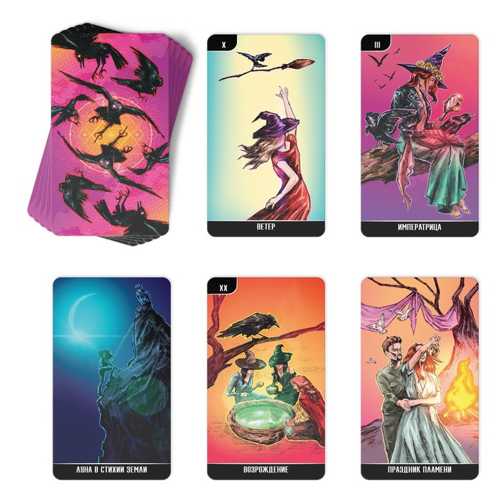 В комплекте собрано 78 карт, на каждой из которых изображены образы ведьм. Работа с ними заключается в раскладах, анализе карт, помогающих открыть завесу тайн и познать неизведанное.