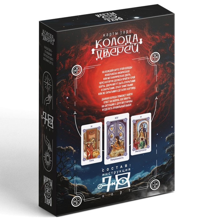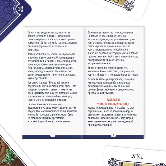 Толковать значения карт можно опираясь не только на классические смыслы, но и на ассоциации, которые вызывает у вас карта. Иногда предсказание проигрывается самой картинкой в буквальном смысле. В трактовке каждой карты есть значение «Ключ» — это совет, который даёт карта, и «Дверь» — это определённая ситуация.
