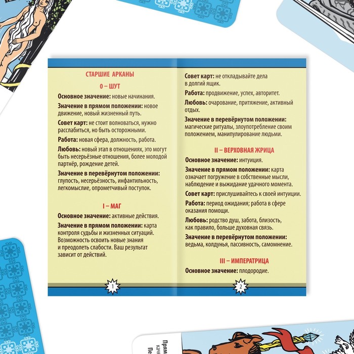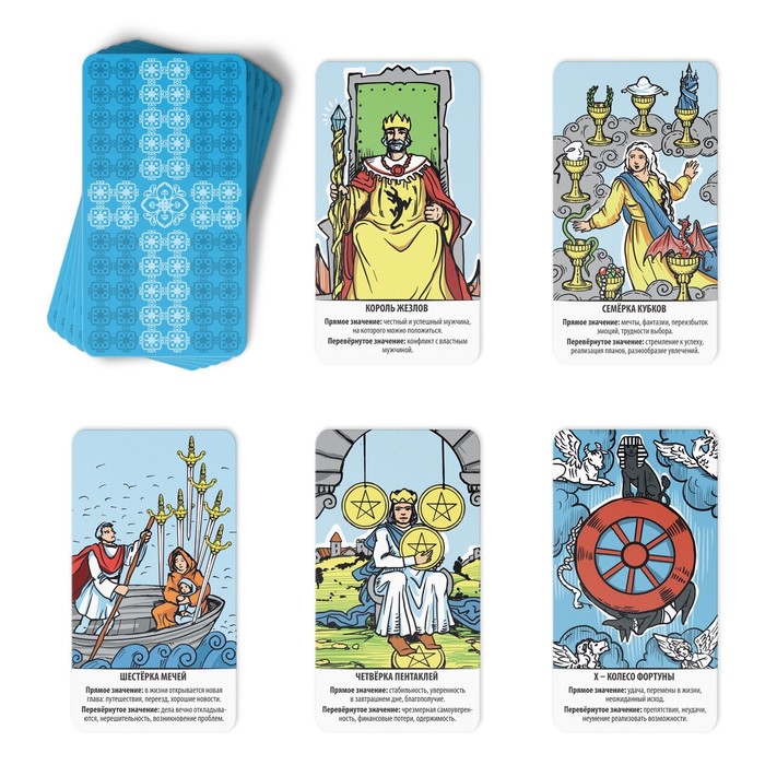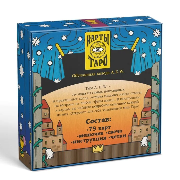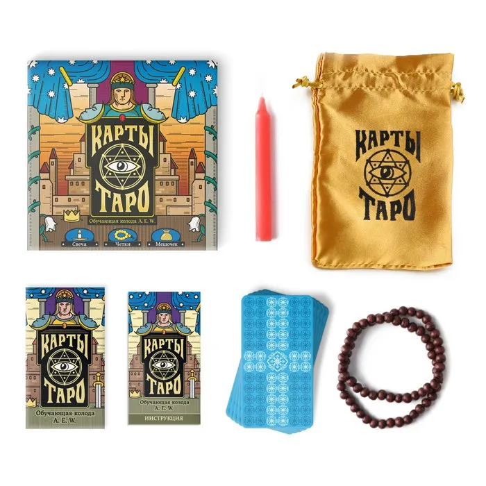 В инструкциях к картам вы найдёте подробное описание и толкование каждой карты, а также популярные расклады. В комплекте также есть мешочек для хранения, чётки и свеча для создания необходимой атмосферы.