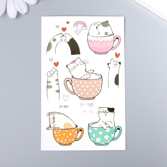 Переводные тату на тело цветная «Котики в чашечках», светятся в темноте, 12×7.5 см