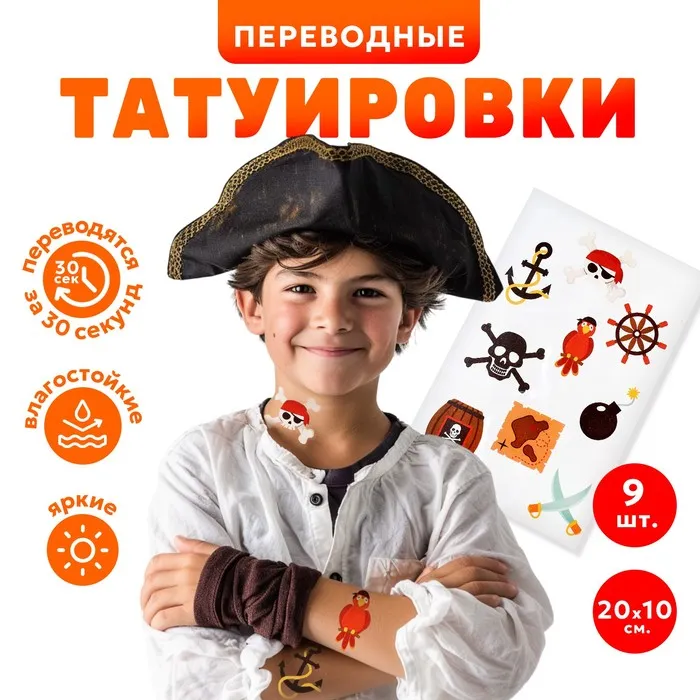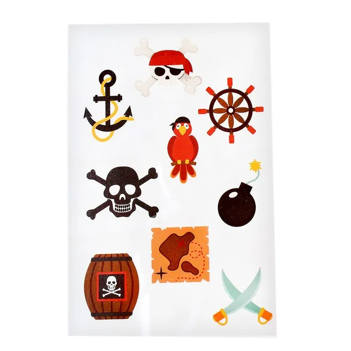 Набор татуировок поможет создать неповторимый образ маленькому любителю приключений! Татуировки с пиратской тематикой подойдут для различных мероприятий и праздников. Они станут отличным дополнением к карнавальному костюму или тематической вечеринке.