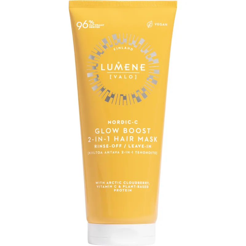 Lumene Nordic-C [Valo] Glow Boost 2-in-1 – это интенсивный уход для волос, который помогает восстановить повреждения и придать волосам сияние от корней до кончиков! После использования волосы становятся питательными, мягкими и легкими, а также выглядят красиво и блестяще. Веганская формула на 96% состоит из натуральных ингредиентов, включая северную облепиху, витамин C и растительный протеин. Средство можно использовать как смываемый, так и несмываемый уход!