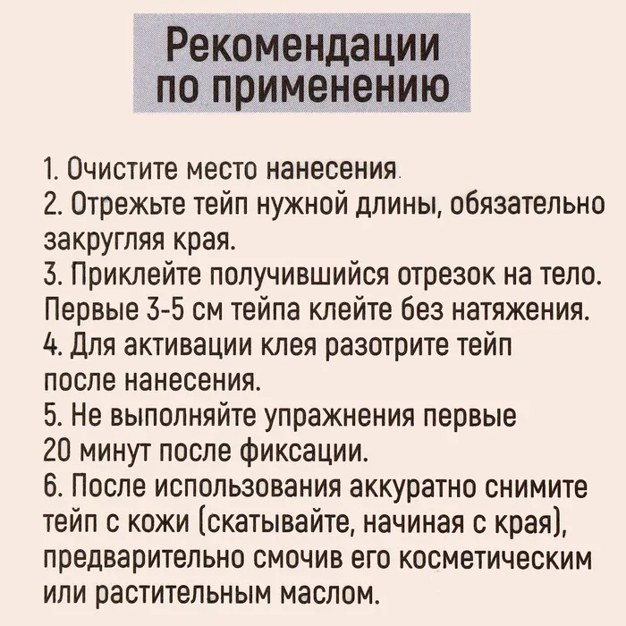 Для начала нужно закруглить края тейпа: это позволит ему дольше держаться на коже. Первые несколько сантиметров тейпа нужно наносить без натяжения. После наклеивания тейпа слегка разотрите его. На поверхности кожи она может держаться до 5 дней.