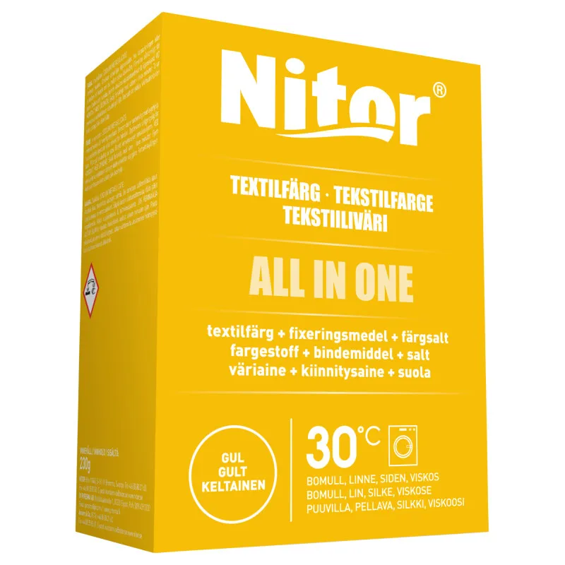 Текстильная краска Nitor All-in-One Желтая содержит краситель, закрепитель и соль в одном продукте! Краску можно использовать уже при 30 градусах. С помощью All-in-One текстильной краски вы можете окрашивать хлопок, лен, шелк, вискозу, джут и смешанные ткани. Не подходит для полиэстера и акрила.