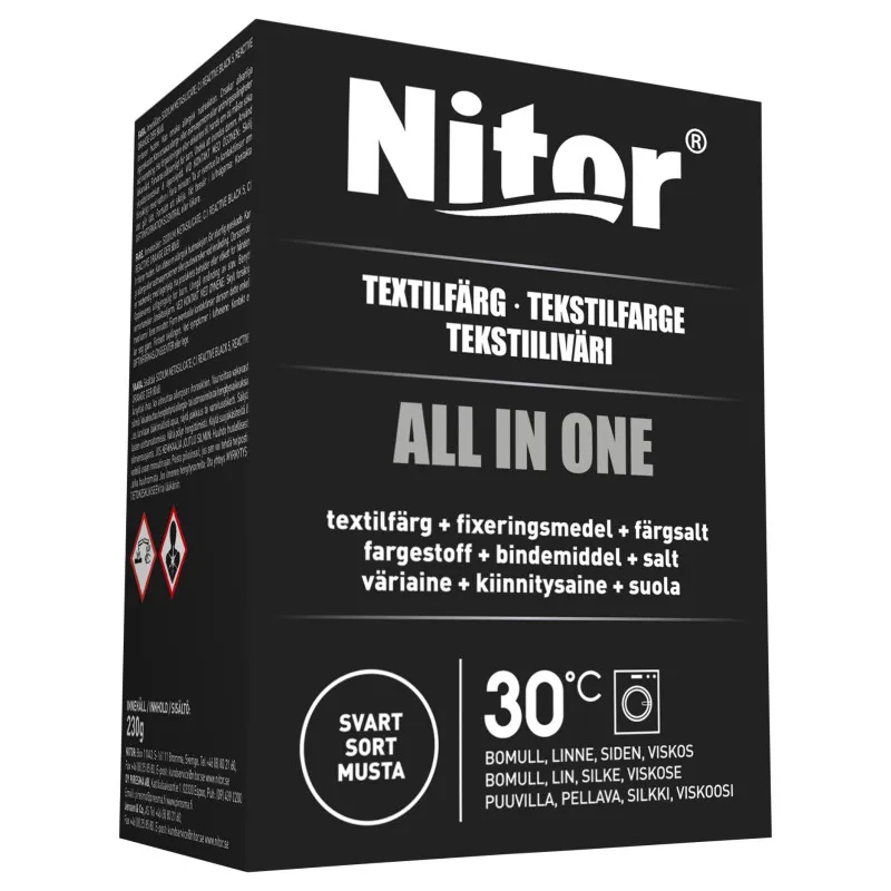 Текстильная краска Nitor All-in-One Черная содержит краситель, закрепитель и соль в одном продукте! Краску можно использовать уже при 30 градусах. All-in-One подходит для окрашивания хлопка, льна, шелка, вискозы, джута и смесовых тканей. Не подходит для полиэстера и акрила.