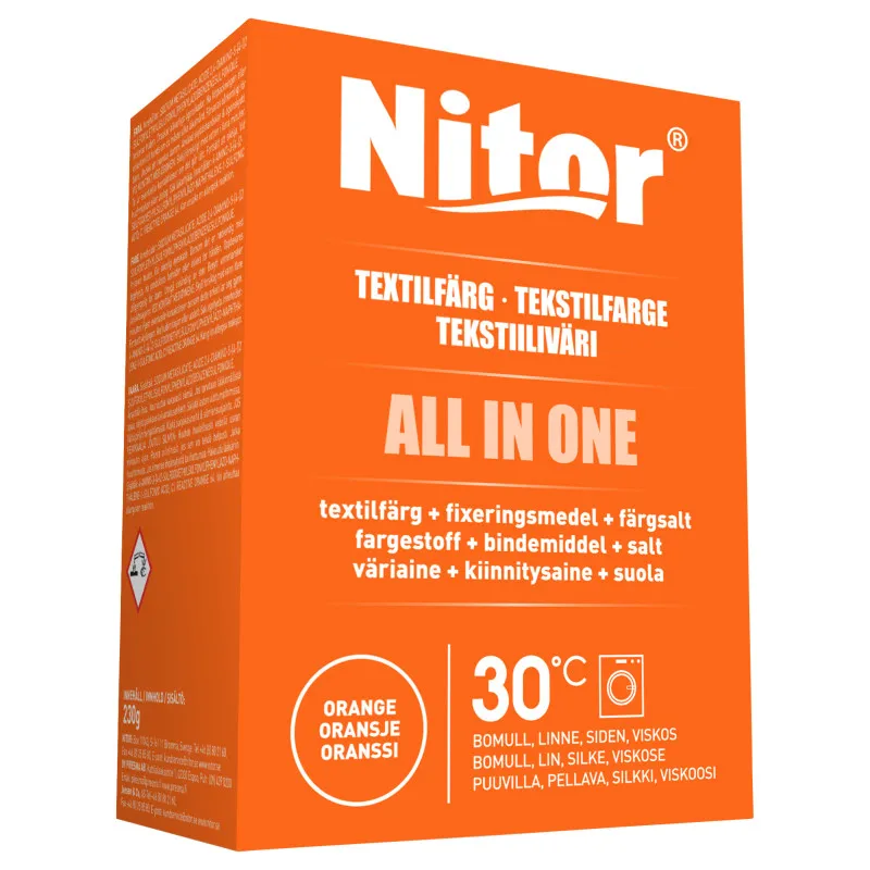 Текстильная краска Nitor All-in-One Оранжевая включает в себя краситель, закрепитель и соль в одном продукте! Ее можно использовать уже при температуре 30 градусов. С этой краской вы сможете окрашивать хлопок, лен, шелк, вискозу, джут и смешанные ткани. Не подходит для полиэстера и акрила.