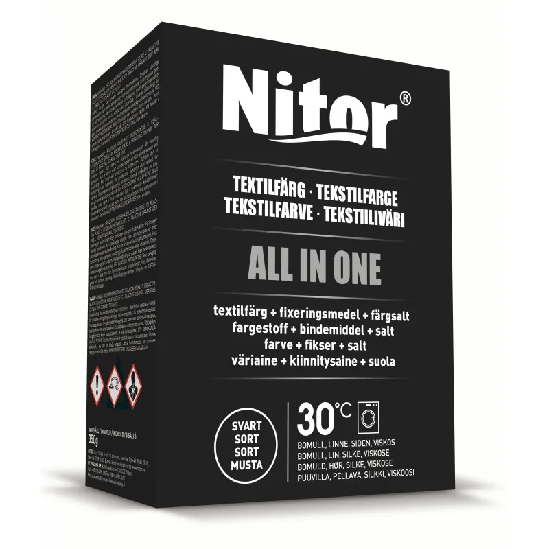 Nitor All-in-One Черная текстильная краска содержит красящее вещество, фиксатор и соль в одном продукте! Текстильную краску можно использовать уже при 30 градусах. С краской All-in-One вы можете окрашивать хлопок, лен, шелк, вискозу, джут и смешанные ткани. Не подходит для полиэстера и акрила.