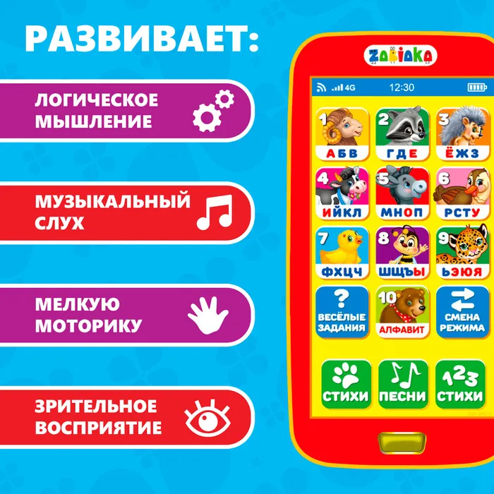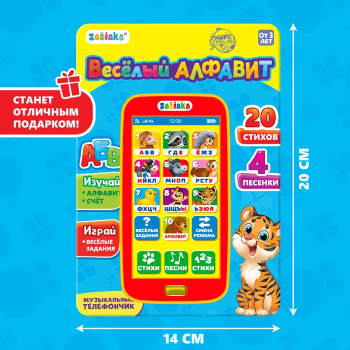 Музыкальный телефончик «Весёлый алфавит» привлечёт внимание трогательным дизайном и надолго займёт малыша благодаря множеству полезных функций. Игрушка не только развлечёт ребёнка — с ней можно осваивать новые навыки!