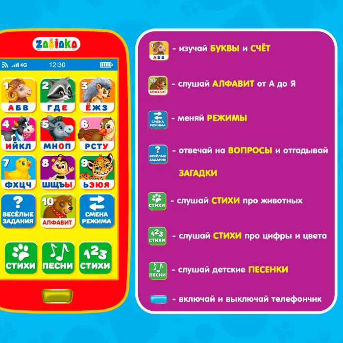 - Игрушка воспроизводит стихи про животных и цифры, и 4 песенки: «Кошкин дом», «Если ты кого-то любишь», «В лес за грибочками», «Весело, весело».