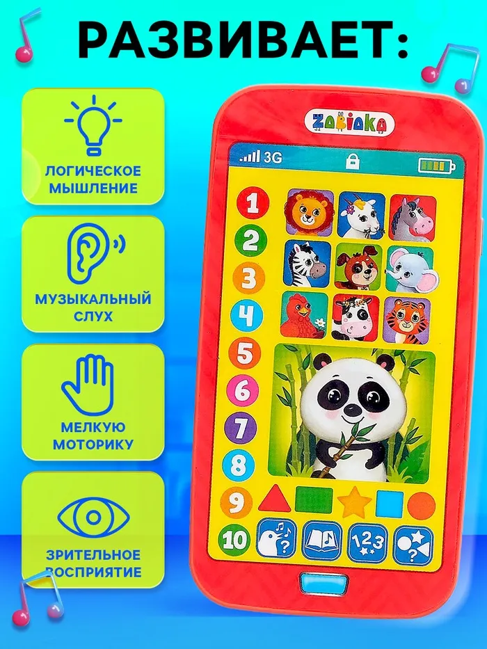 Также в телефоне представлены интересные задачки. Выполняя их, малыш натренирует память, мышление и познакомится с окружающим миром.