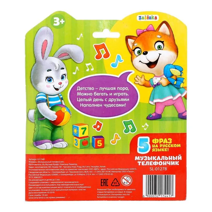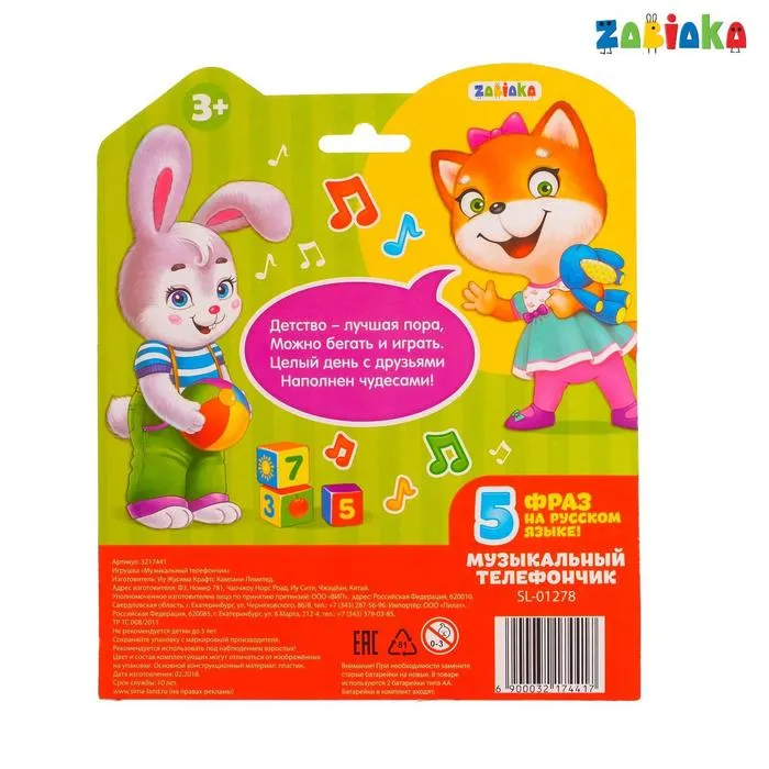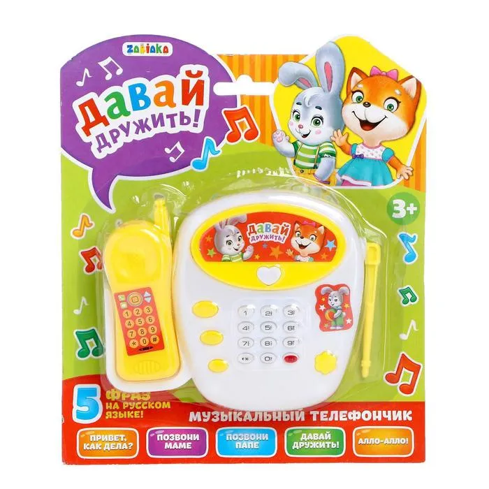 Телефон создан для сюжетных игр. Он помогает развивать моторику и слух у деток. Дизайн игрушки не оставит малышей равнодушными, ведь он выполнен с картинками милых зверят.