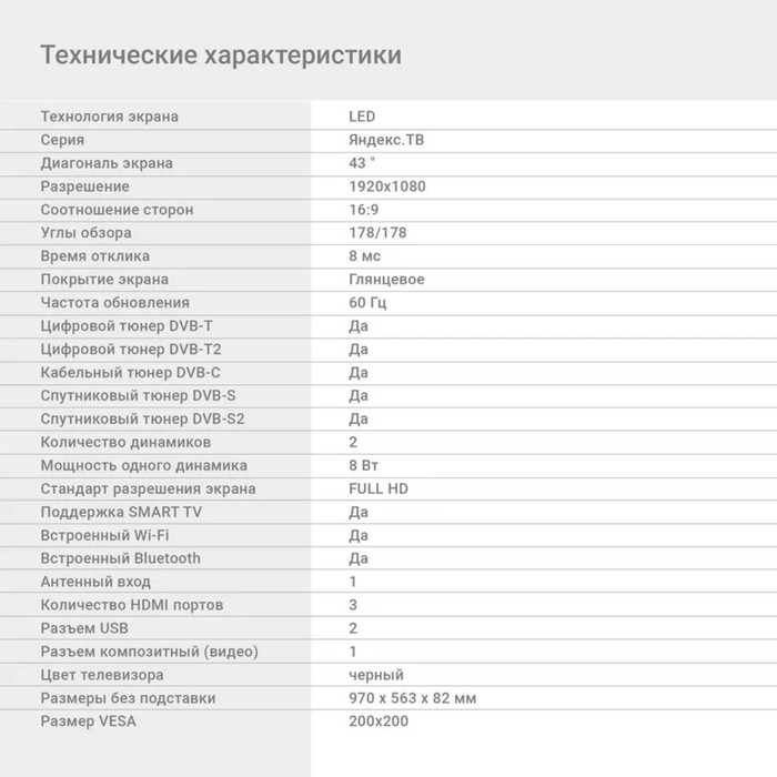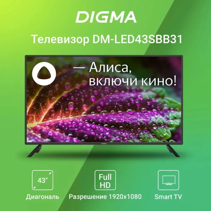 Телевизор Digma DM-LED43SBB31, 43", 1920×1080, DVB-T/T2/C/S/S2, HDMI×3, USB×2, Smart TV — Характеристики