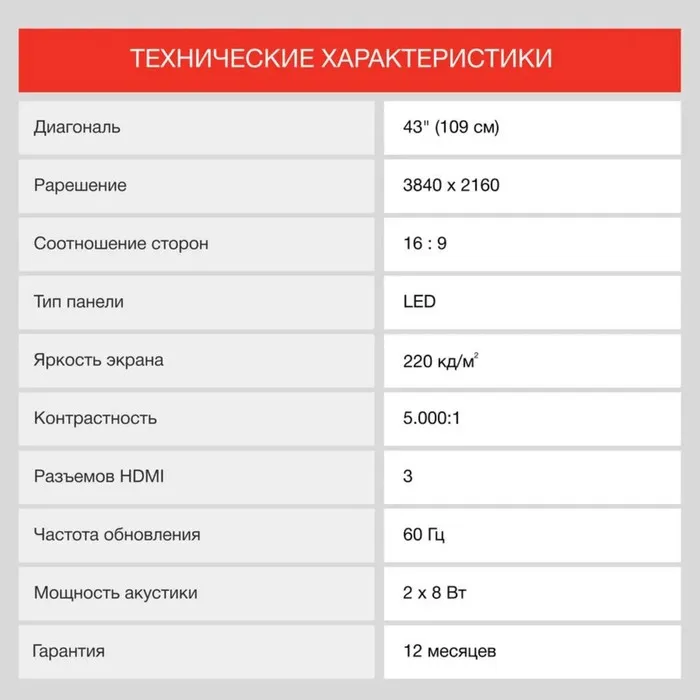 Телевизор Starwind SW-LED43UG400, 43", 3840×2160, DVB/T2/C/S/S2, HDMI×3, USB, Smart TV, серый — Характеристики