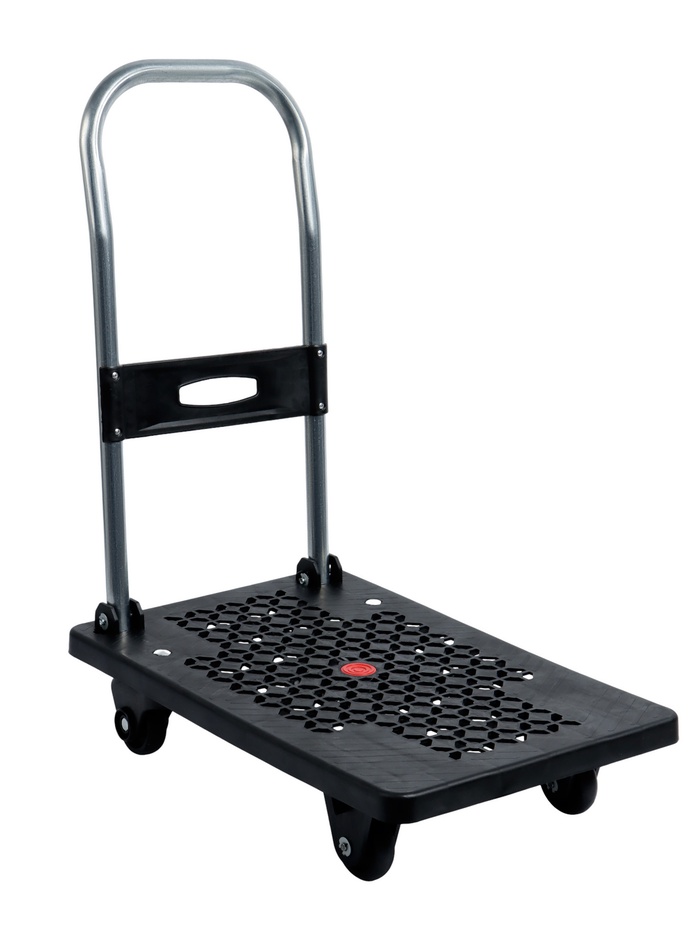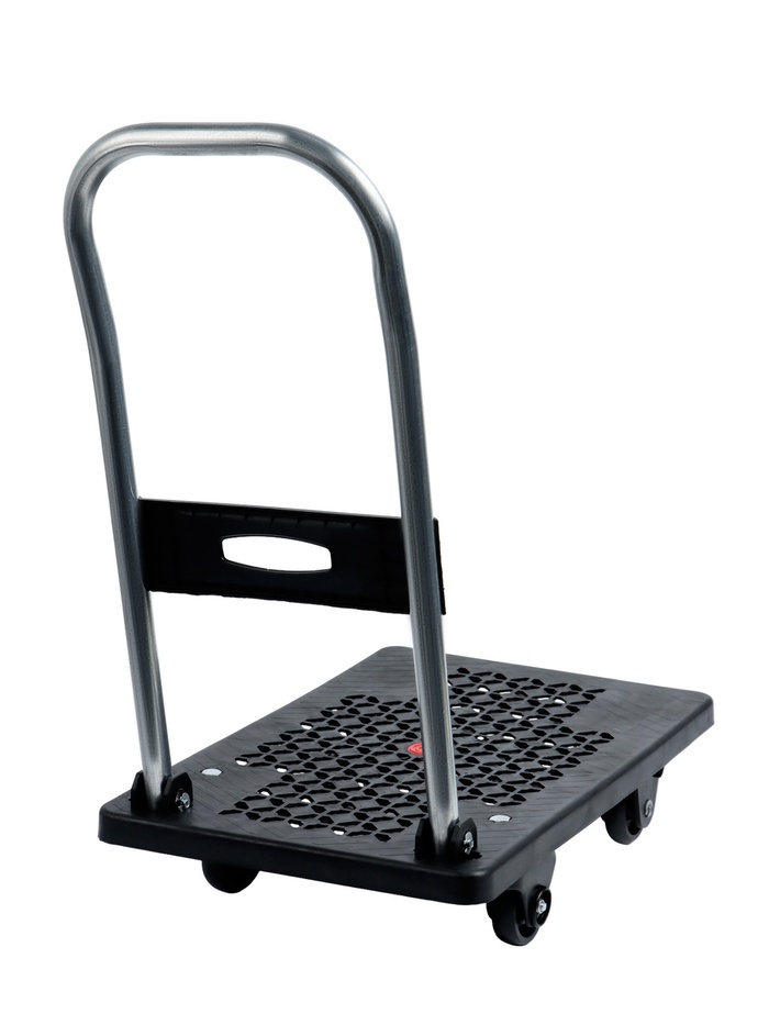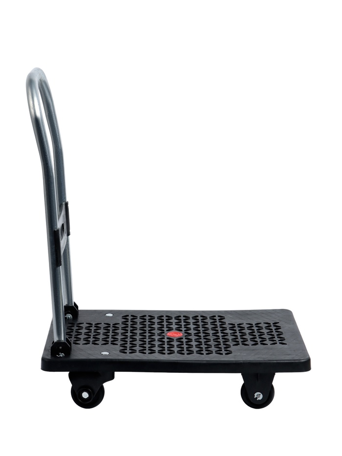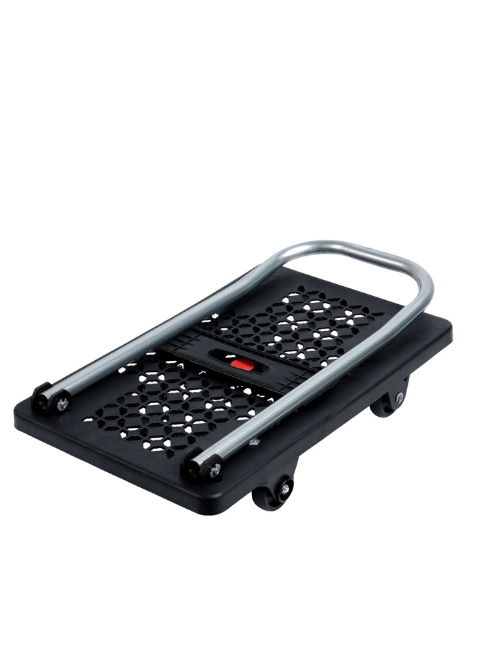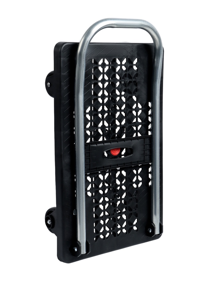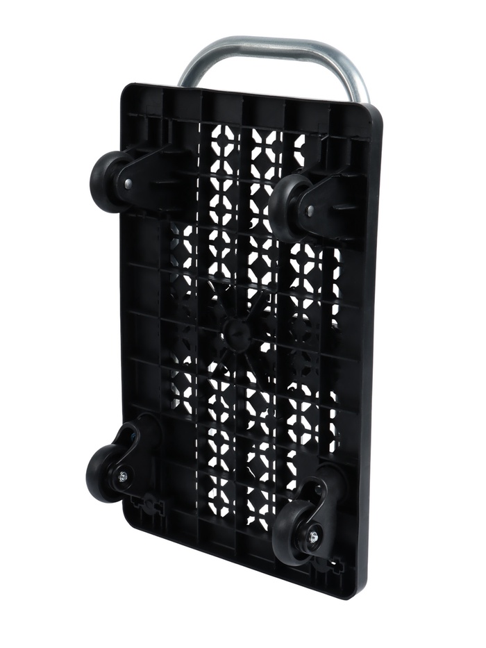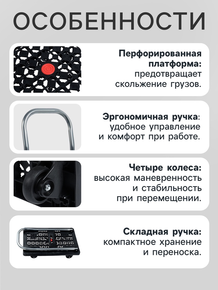 Предназначена для транспортировки различных грузов весом до 50 кг. Конструкция оснащена четырьмя колесами для маневренности, платформа с перфорированной поверхностью предотвращает скольжение и снижает общий вес конструкции. Эргономичная ручка обеспечивает комфортное управление, складная конструкция позволяет компактно хранить тележку, когда не используется.