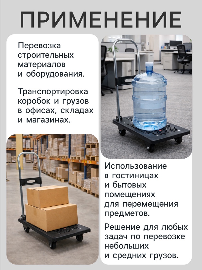 - Транспортировка коробок и грузов в офисах, складах и магазинах.