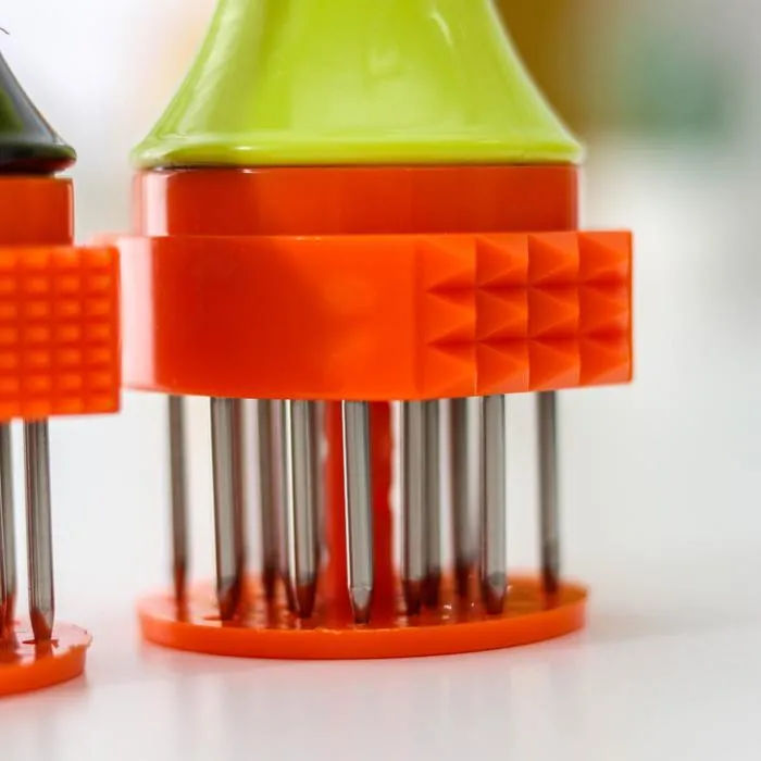 Мясо одновременно прокалывается несколькими острыми ножами по всей своей площади. Благодаря этому оно становится мягче и нежней, рассол и специи лучше проникают между волокон. Тепловые волны легче проходят сквозь ткани разрыхлённого продукта, и мясо прожаривается намного быстрее и равномернее.