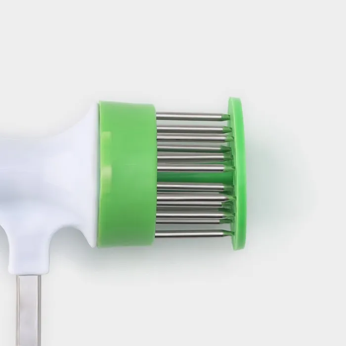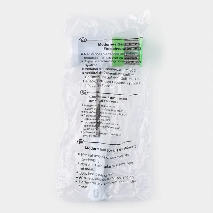 Мясо одновременно прокалывается несколькими острыми ножами по всей своей площади. Благодаря этому оно становится мягче и нежней, рассол и специи лучше проникают между волокон. Тепловые волны легче проходят сквозь ткани разрыхлённого продукта, и мясо прожаривается намного быстрее и равномернее.