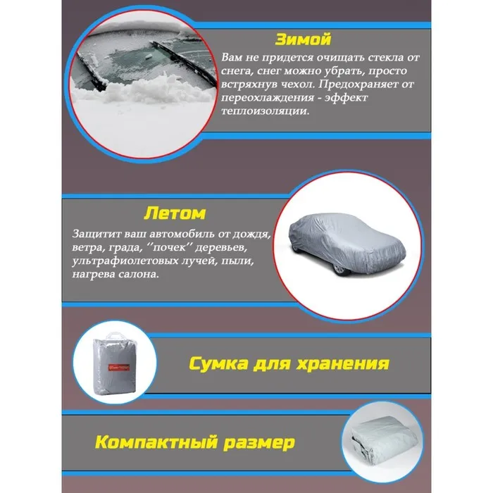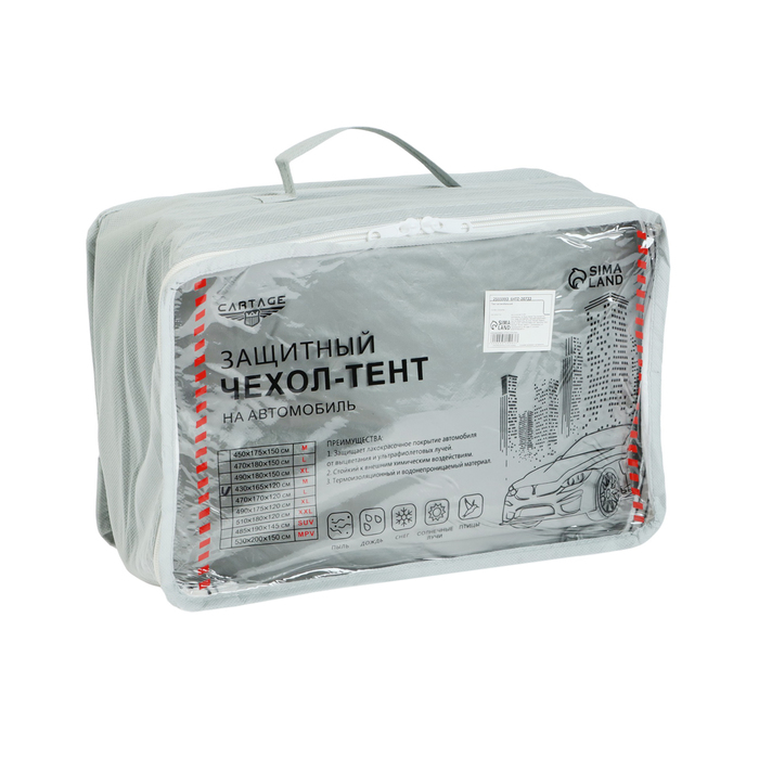 Автомобильный тент от фирмы CARTAGE - идеальное решение для защиты вашего автомобиля от неблагоприятных погодных условий и внешних воздействий. Изготовленный из высококачественного водонепроницаемого полиэстера, он обеспечивает надежную защиту от дождя, снега, пыли, ультрафиолетовых лучей и посторонних взглядов.