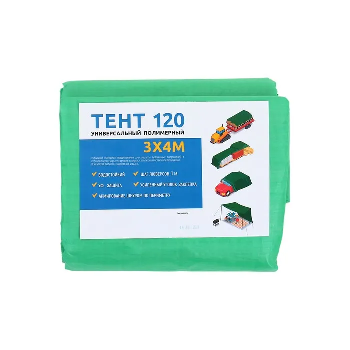 Тент защитный, 4×3 м, плотность 120 г/м², УФ, люверсы шаг 1 м, зелёный/серебристый — Характеристики