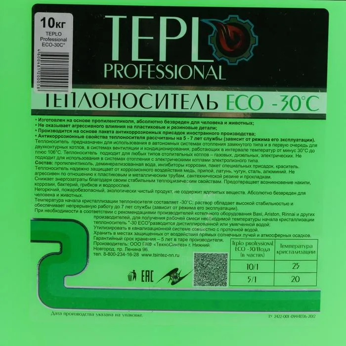 Теплоноситель TEPLO Professional ECO - 30, основа пропиленгликоль, 10 кг — Характеристики