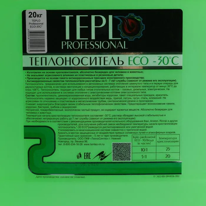 Теплоноситель TEPLO Professional ECO - 30, основа пропиленгликоль, 20 кг — Характеристики
